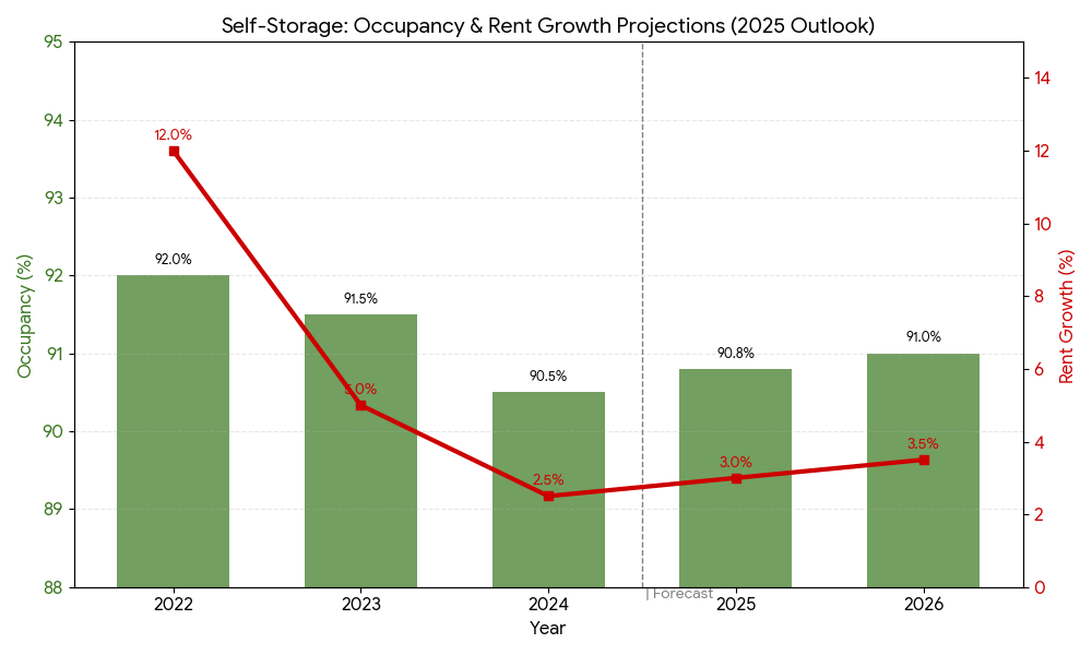 Figure 1: Storage Occupancy (bar) and Rent Growth (line) by year, with forecasts. National occupancy has stabilized above pre-pandemic levels (projected near 90–91%). Rent growth is positive but moderate, expected in the 1.5–3.5% range as the market balances supply.